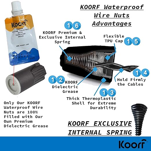 • ✔ APPLICATIONS IN MANY INDUSTRIES, PROBEN RESISTANCE TO VIBRATIONS: All our Waterproof Wire Nuts are Filled only with our Own KOORF DIELECTRIC GREASE, tested in Pumps, heavy equipment, and used as automotive electrical connectors with a top-of-market vibrations resistance. OUR DIELECTRIC GREASE is also available on Amazon under the part number B0B8XJ5JXP (ASIN) and also in our store. More Reliable: Our waterproof wire connector is RoHS Compliant. / We applied and complied with RoHS testing to protect our customers keeping you and your customers safer and weatherproof.