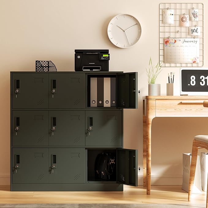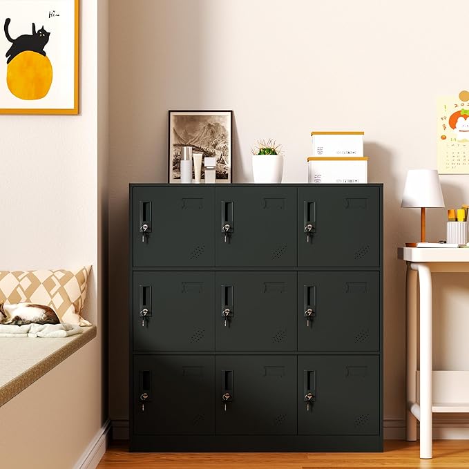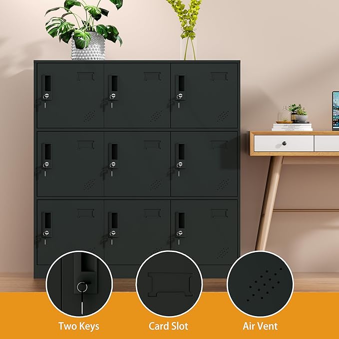 9 Doors Metal Lockers for Employees, Steel Storage Locker with Lock and Card Slot,Lockable Office Metal Storage for School Office Gym Bedroom,Garage (Black)