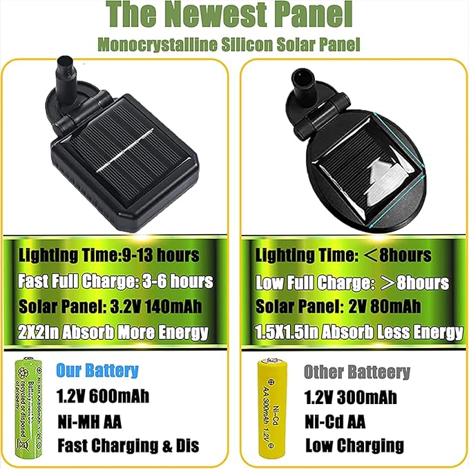 • 【Auto Turn On/Off From Dusk To Dawn】: This solar garden lights solar panels are monocrystalline silicon, and the rest are polycrystalline silicon. The solar light absorbed by monocrystalline silicon is more efficient. Automatic opening at night and automatic closing at dawn, environmental protection and energy saving. The lamp is powered by a 1200mAh rechargeable battery and can be fully charged in 4-6 hours in sunny weather. When fully charged, it can last 8-15 hours at night.
