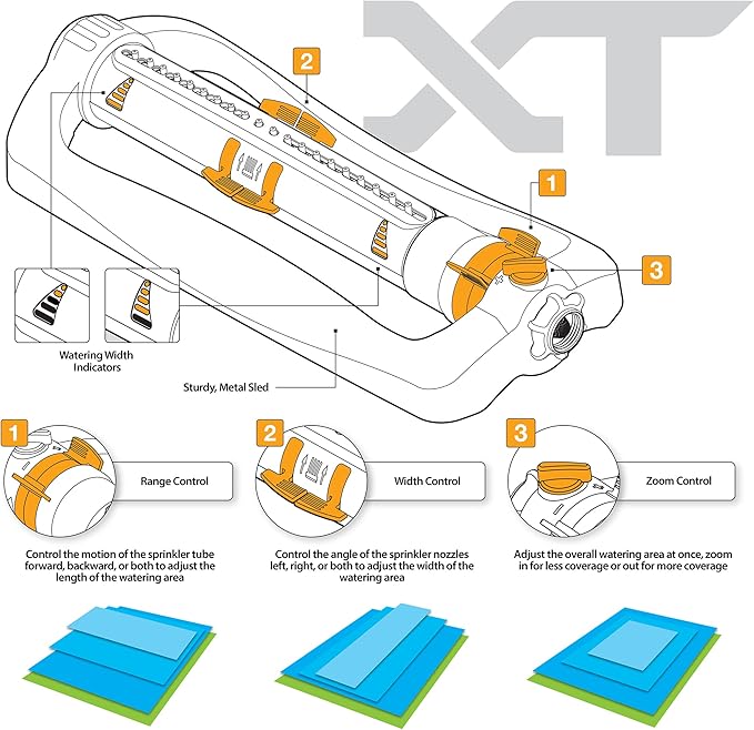 • Zoom Control adjusts the overall watering area. Zoom in for a small patch of newly seeded lawn or all the way out to cover a large section of the yard.