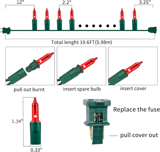 • 【Green Wire Christmas String Lights Decoration】:100L traditional incandescent Christmas light set,19.6Feet Red Christmas Mini String Lights,each set include 4 Extra Bulbs & 2 Replacement Fuses.Perfect for indoor and outdoor decoration.Plug in,put it where you want,watch and enjoy this light.The light can be reused for many years.