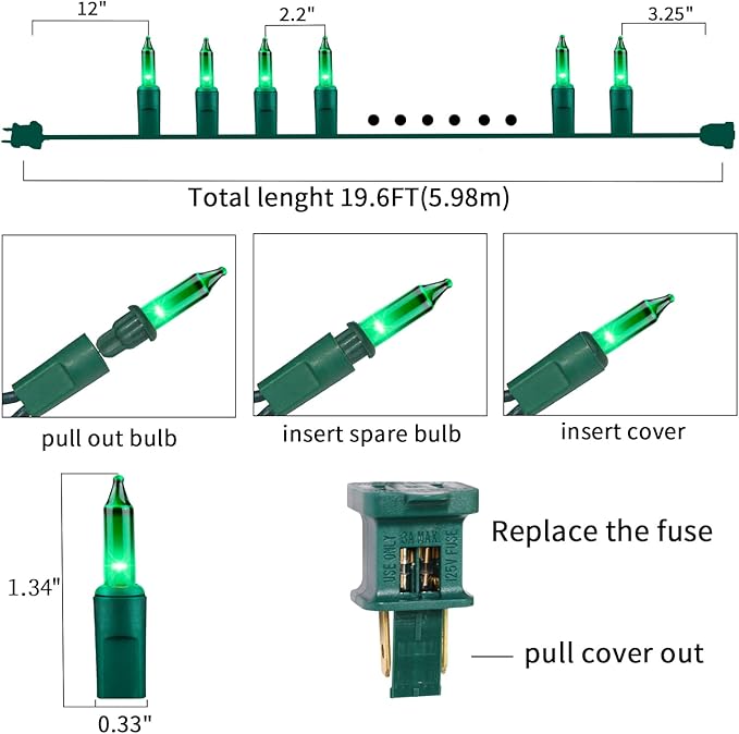 • 【Green Wire Christmas String Lights Decoration】:100L traditional incandescent Christmas light set,19.6Feet Green Christmas Mini String Lights,each set include 4 Extra Bulbs & 2 Replacement Fuses.Perfect for indoor and outdoor decoration.Plug in,put it where you want,watch and enjoy this light.The light can be reused for many years.