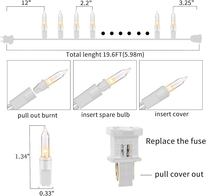 • 【White Wire Christmas String Lights Decoration】:100L traditional incandescent Christmas light set,19.6Feet Clear(Warm White) Christmas Mini String Lights,each set include 4 Extra Bulbs & 2 Replacement Fuses.Perfect for indoor and outdoor decoration.Plug in,put it where you want,watch and enjoy this light.The light can be reused for many years.