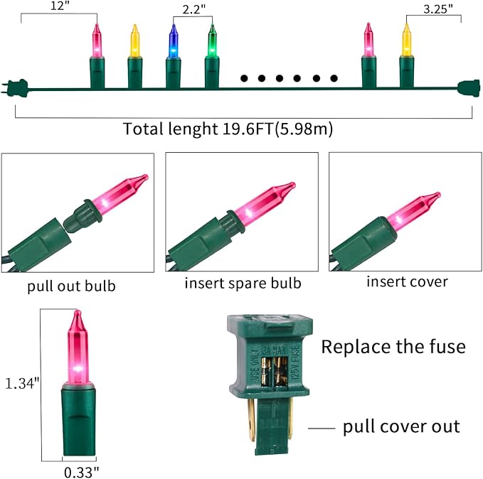 • 【Green Wire Christmas String Lights Decoration】:100L traditional incandescent Christmas light set,19.6Feet Multi Christmas Mini String Lights,each set include 4 Extra Bulbs & 2 Replacement Fuses.Perfect for indoor and outdoor decoration.Plug in,put it where you want,watch and enjoy this light.The light can be reused for many years.