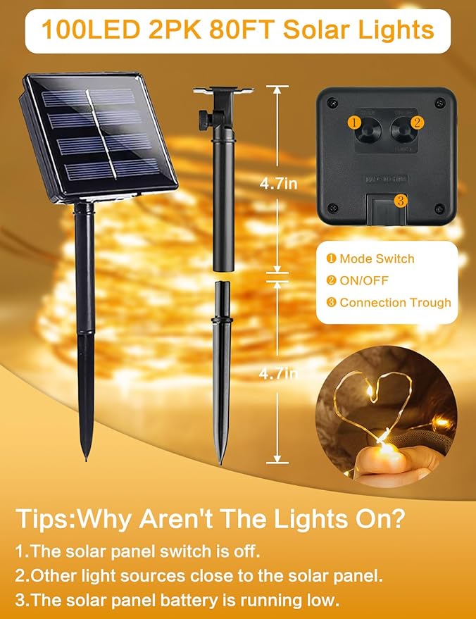 • [Solar Lights Outdoor Waterproof] : Solar fairy lights and solar panels are IP65 waterproof, windproof, snowproof and heat-resistant, so they can be used in rain, snow or hot weather without worrying about short circuits or damage, solar fairy lights are suitable for outdoor use. Solar string lights outdoor waterproof will be a great choice.