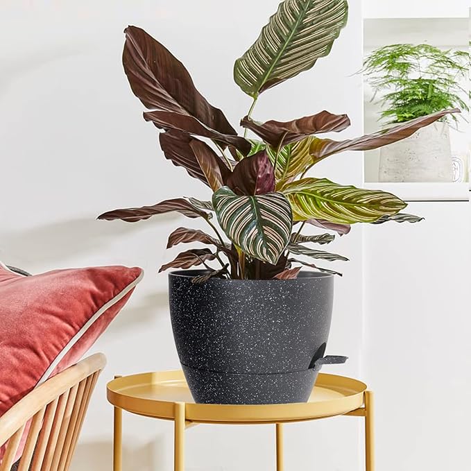WOUSIWER 10 inch Self Watering Planters, 2 Pack Large Plastic Plant Pots with Deep Reservior and High Drainage Holes for Indoor Outdoor Plants and Flowers, Speckled Black