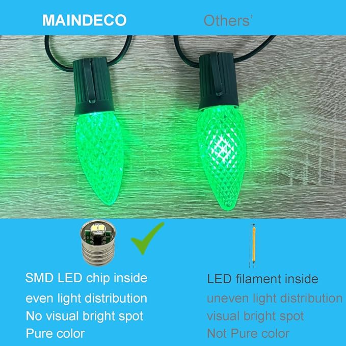 • C9 Multicolor LED Pathway Lights - MAINDECO C9 Christmas walkway lights are 30 feet long in total which contain 20 multicolor C9 LED SMD strawberry faceted bulbs with 18 inches spacing, 20 Stakes, E17 base sockets. After installing the ground stakes, it can be fixed in the ground to add Christmas holiday lights to your yard, garden and pathway, etc.