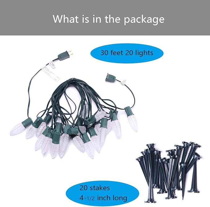 • C9 White LED Pathway Lights - MAINDECO C9 Christmas walkway lights are 30 feet long in total which contain 20 cool white C9 LED SMD strawberry faceted bulbs with 18 inches spacing, 20 Stakes, E17 base sockets. After installing the ground stakes, it can be fixed in the ground to add Christmas holiday lights to your yard, garden and pathway, etc.