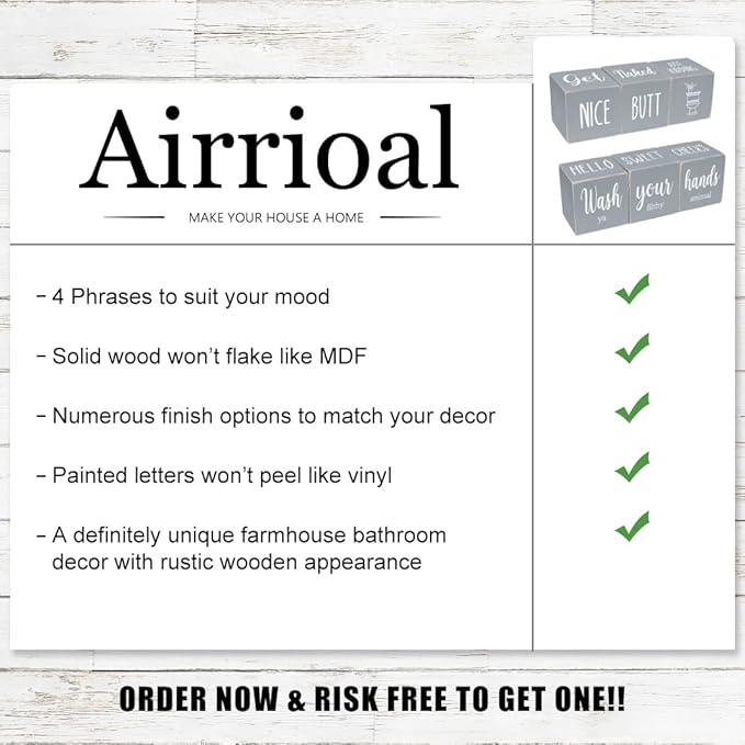 • 【FOUR-SIDED FUNNY BATHROOM SIGNS】- Printed with four-sided funny signs, Get Naked, Nice Butt, Hello Sweet Cheeks and Wash Your Hands.The farmhouse rustic blocks decor is in unique design that could bring funny and relaxing feeling for room atmosphere. A good way to make the first-visiting guest laugh happily, thinking that you were cheerful and outgoing, feeling relaxed and getting closer.