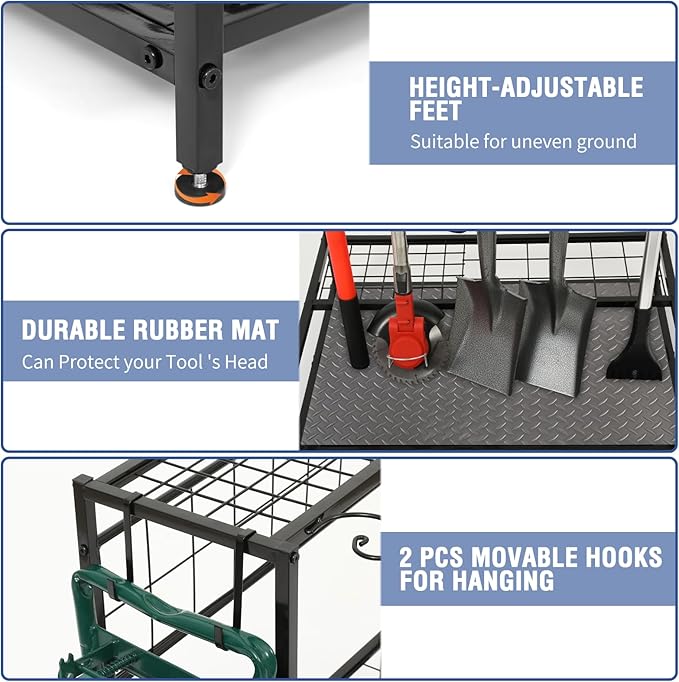 • INNOVATIVE GARAGE ORGANIZATION: G-hooks allows for electric tools like string trimmer and some tools with D-grip handle, height-adjustable feet suitable for uneven ground, durable rubber mat can protect your power garden tool 's head