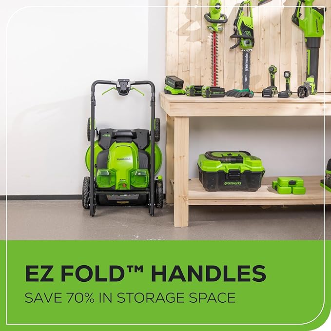 • MAINTENANCE FREE – This self-propelled lawn mower is virtually maintenance free, with no gas, no oil, and no emissions. Push button start, quiet operation, and delivers gas-like performance. Use up to 70% less space in your garage with vertical storage.