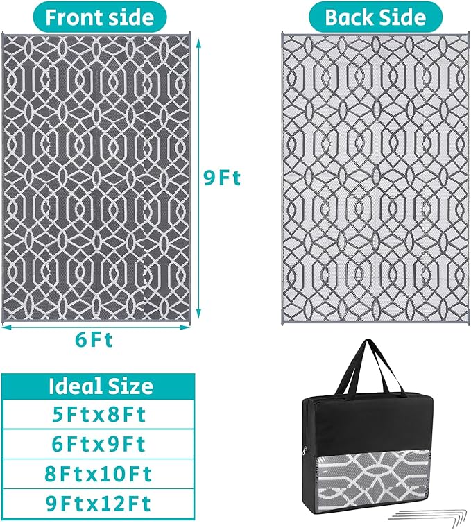 • Versatile Outdoor Carpet: The indoor outdoor plastic rugs have multiple choice in different colors(4'x6',5'x8',6'x9',8'x10',9'x12',9'x18',8'round), is ideal for a variety of indoor outdoor activities,like patio mat, deck rug, garden rug, beach mat, picnic mat, BBQ party mat, rv camping rug,pool rug,outdoor doormat,garage rug,front door mat,allowing you to have plenty of imaginable space for more fun.