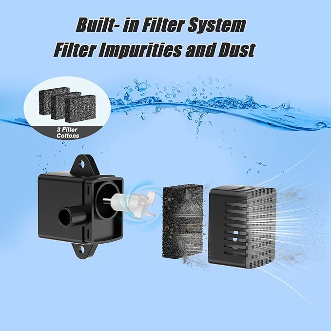 • Blocking Protection System: Solar powered fountain comes with an anti-clogging technology, it will stop working automatically when the filter cotton or rotating shaft is blocked in the direct sunlight; Tips: If the solar fountain stop working, please clean the filter cotton and rotating shaft; Please do not put the solar fountain in a place where there is no water and the sun shines directly to avoid dry working