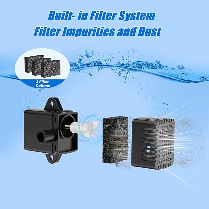 • Blocking Protection System: Solar powered fountain comes with an anti-clogging technology, it will stop working automatically when the filter cotton or rotating shaft is blocked in the direct sunlight; Tips: If the solar fountain stop working, please clean the filter cotton and rotating shaft; Please do not put the solar fountain in a place where there is no water and the sun shines directly to avoid dry working