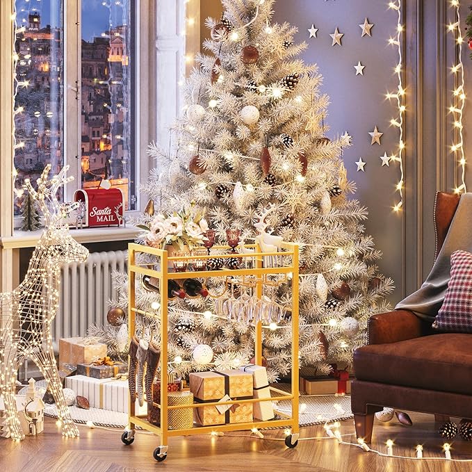 • [Multifunctional Cart] Our bar cart has 4pcs 360° rotating casters, 2 of which are equipped with brakes to prevent sliding when stopped. Except for being a bar servicing cart, it also can be used as kitchen cart, coffee cart, drink cart, microwave stand cart, make an accent statement in your entryway, kitchen, living room or office room with a decorative.