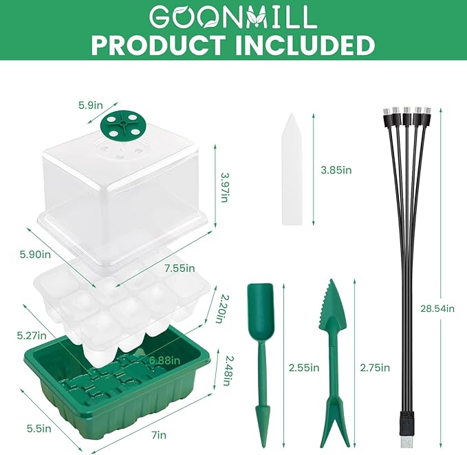 • 【Package include】5 x Germination Trays (with Grow Light and LED plant light switch), 5 x Watertight Base Tray, 5 x Humidity Dome, 10 x Plant Labels and 2 x planting tools (A must have for seedling)