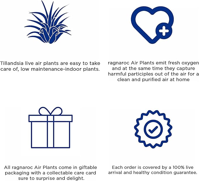 • HEALTHY PLANT ARRIVAL ASSURANCE: ragnaroc is committed to delivering vibrant and thriving air plants to your doorstep. Our live air plants are packed directly from Florida, and every order comes with a promise of their safe and healthy arrival. If, for any reason, you find yourself less than satisfied with our plants, please inform us, and we will promptly arrange a full refund or send you replacement plants.