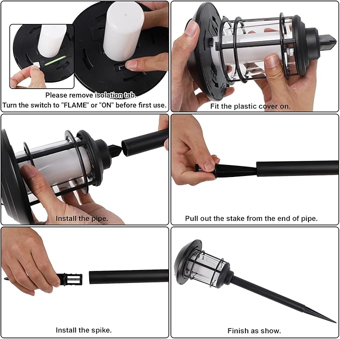 • FLICKERING FLAME TORCH LIGHTS: Connect the light, pole and stake(inside the pole), insert the stakes into the soft soil or ground where there has direct sunlight. Solar LED flickering flameless garden pathway lights, add a 360 degree viewing angle illuminate charming to your garden, decorate your fence, deck, porch or yard. Size with Stake- 4.9 x 4.9 x 17 inches