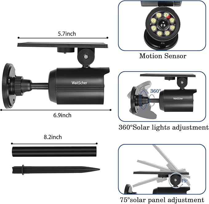 • Fake Security Camera with Solar Motion Lights: This solar motion lights outdoor shape imitates the shape of a bullet surveillance camera. A dummy camera with a red indicator light is almost as useful as a real one in deterring burglars and intruders but at a much lower cost( about 1⁄4 of a real security camera) providing secure illumination and protection for the dark corner of your house, especially for those who live alone