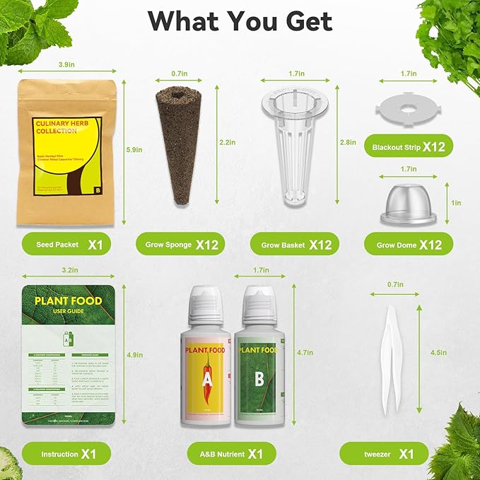 • Variety of Seeds: This herb seed pod kit includes seven types of heirloom seeds—basil, parsley, shiso, liquorice, mint, cilantro, and chicory—along with 12 grow sponges, 12 grow domes, 12 grow baskets, 12 foil stickers, and A&B plant food. Perfectly designed for the Inbloom 12-Pod HydroGarden. With over 350 seeds, you can grow your favorites and enjoy endless indoor gardening fun!