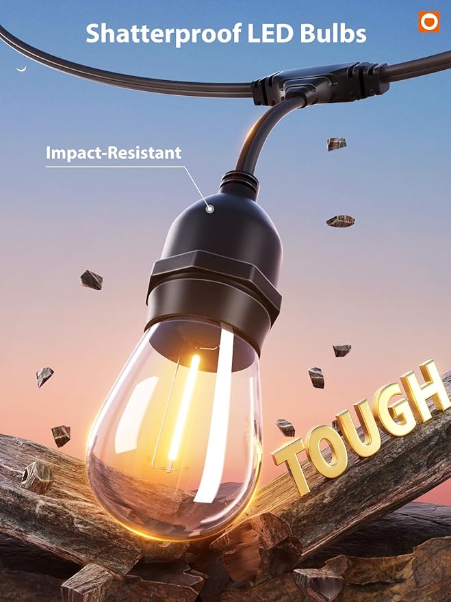 • Weatherproof & Heavy-Duty Construction : These ETL-listed, commercial-grade string lights for outside are engineered for year-round use. The robust insulation shields against extreme weather—sun, rain, wind, snow, and dampness—ensuring reliable indoor and outdoor lighting performance. The flexible cord adds lasting durability for versatile applications.