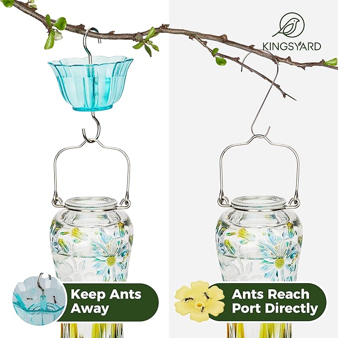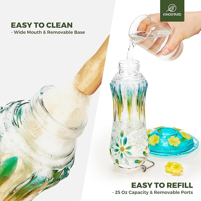 • 【EASY TO REFILL & CLEAN】Features clear glass and wide-mouth reservoir, making seeing and refilling nectar simple; The top of the 2-part base easily separates from the bottom for thorough cleaning; Regular cleaning will keep the feeder work better to attract lovely birds visiting