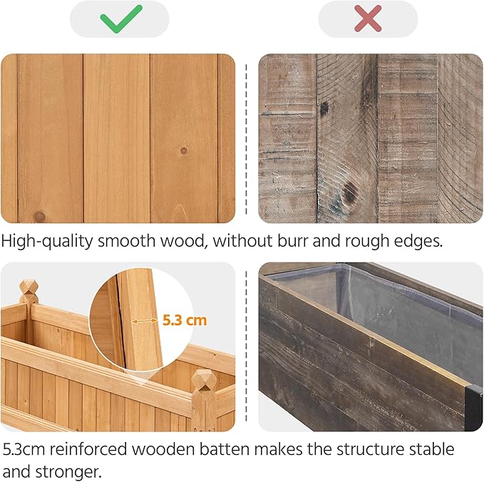 • SINGLE-PIECE SIDE PLATE -- Comparing with other planting beds with several small wooden plates at the side, our planting raised bed has a whole side board at each side. It is fixed firmly without leakage of soil. The entire structure is very stable, and the installation is effortless