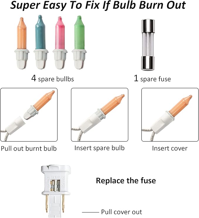 • High Quality: Build-in 3A fuse and pass with UL certified, is safety for both indoor and outdoor decorations. Each bulb works individual, others will work well when one bulb is defective. Just use the spare bulbs to replace the defective bulb.