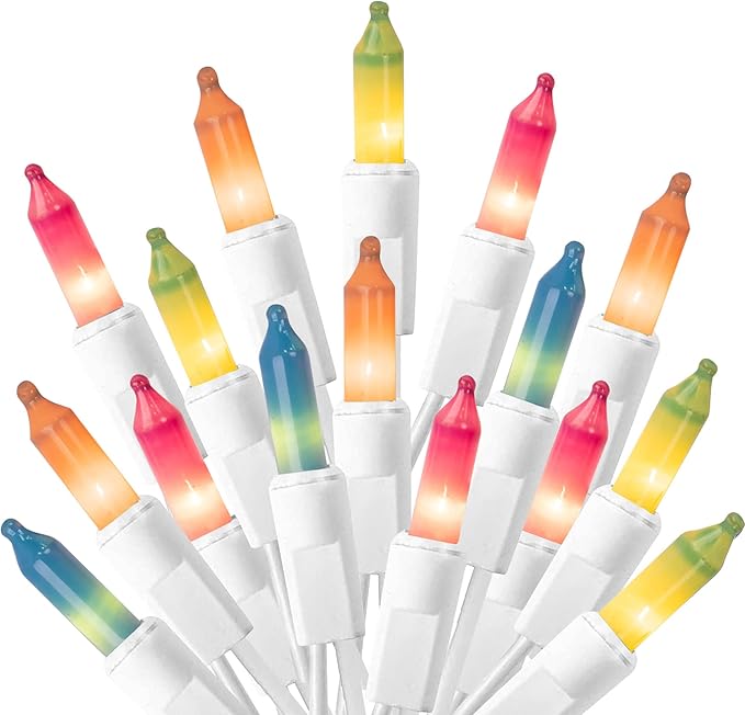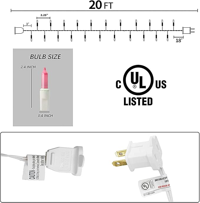 • Light Specifications: With 100 incandescent lights, the lighted length of the lights is 18.5 ft, the leading wire is 1.5 ft, and the bulb space is 2.25 inch. Work voltage of each bulb is 2.5V / 0.42W, safety with built in 3A fuse. Package include: 1 x 20 ft mini string light, 1 x spare fuse, 4 x spare incandescent bulbs.
