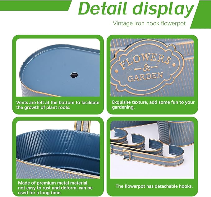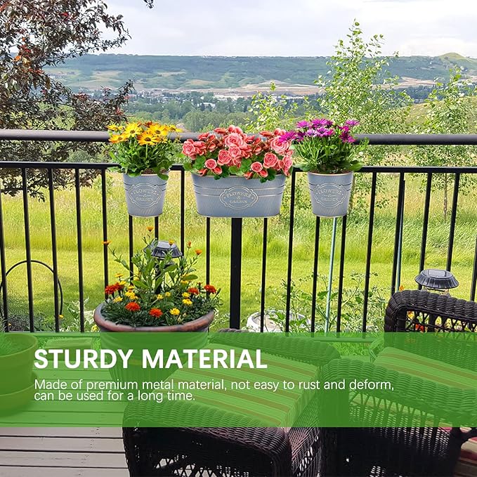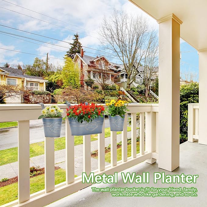 PerGar Vintage Metal Iron Wall Hanging Flower Pots, Rustic Planter Bucket Herb Flower Plant Holder with Detachable Hooks & Drainage Hole for Railing Fence Balcony Deck Garden Home Decoration, Set of 3