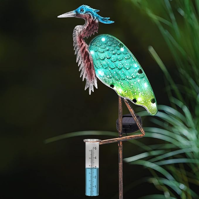 • 3-in-1: This rain gauge can not only record rainfall and let flowers and lawn grow better, but also its unique design can decorate your garden with soft lighting. This 3-in-1 heron rain gauge garden stake is a lovely accent piece to be enjoyed at night as well!