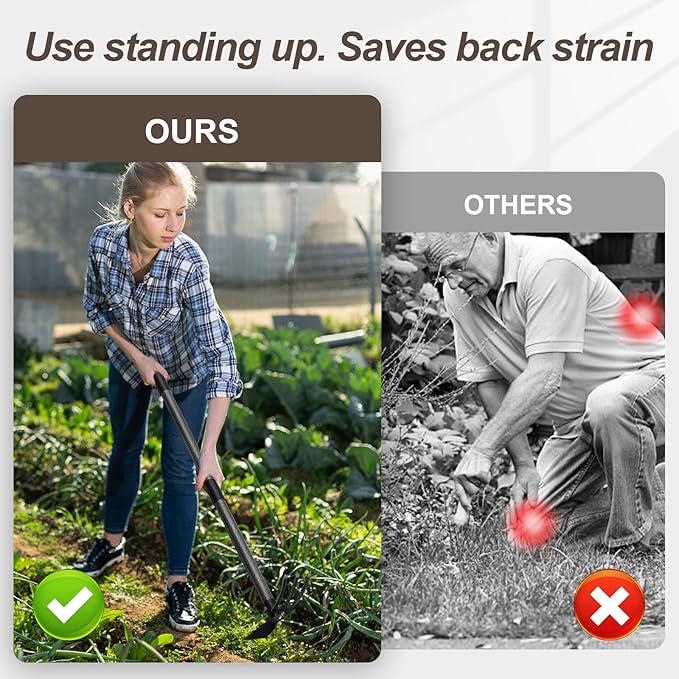 • No Bending Need: 45 Inch long overall. This hoe garden tool long handle handle is ergonomically designed to reduce the pain in joint caused by the bending of your back when doing yard work.