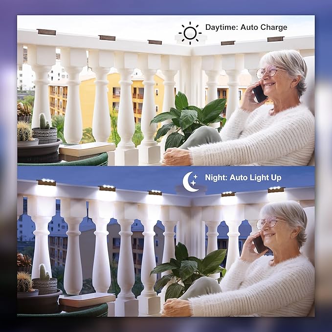 • 【Solar Powered and Automatic Work Mode】The balcony lights is powered by Solar, which means free electricity and no wires. Free your hands on switching the solar deck lights for outside on/off all the time as this special solar decoration lights would automatically turn on at dusk and turn off at dawn