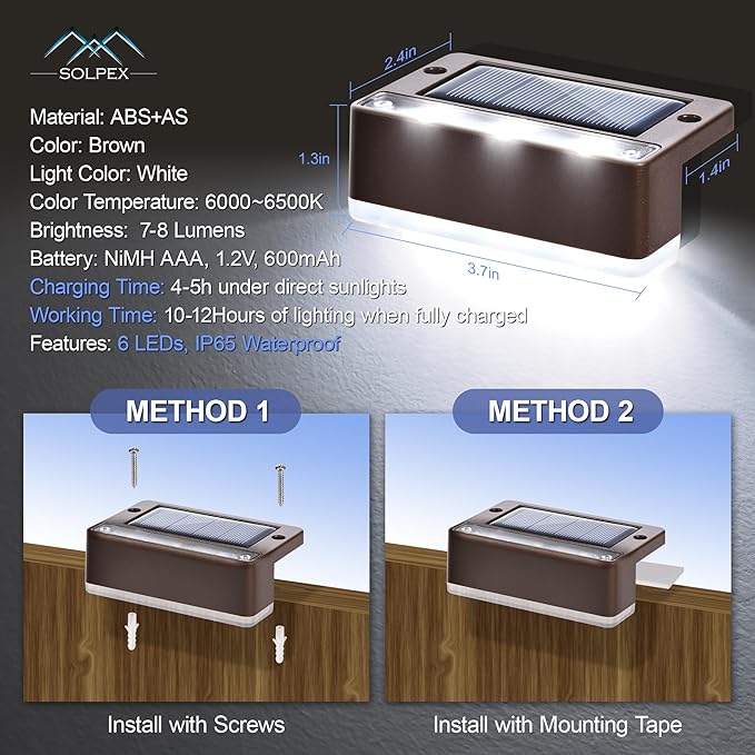 • 【IP65 Waterproof & Long working time】The deck lights solar powered are designed with IP65 waterproof. With the upgraded solar panel and rechargeable battery, the solar step lights for outside can illuminate up to 15 hours after fully charged for 4-6 hours with direct sunlight