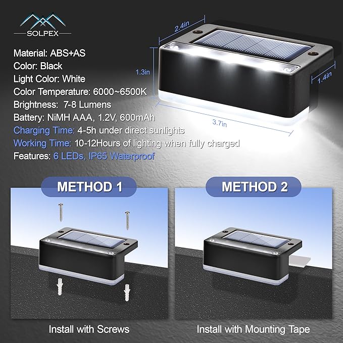 SOLPEX Solar Fence Lights, 6 LEDs Solar Lights Outdoor Waterproof Solar Powered for Deck, Stair, Front Porch, Balcony, Walkway, Garden, Yard, Patio, Pool Decor, IP65 Waterproof (4 Pack, Cold White)