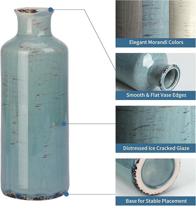 • Elegant Look: The distressing techniques are adopted to make these three vases so stunning. There is crackled rustic design on the surface of the vases They fit various types of styles, such as modern farmhouse, rustic, classic charm, country, and elegant yet simplistic. The sizes and shapes of these three vases are specially designed, they are in perfect harmony while using together.