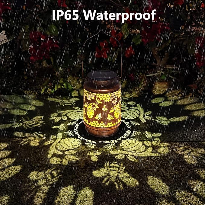 • Graceful Decorative Design - The retro appearance, with gold copper color and hollow out metal veneer, the solar outdoor lanterns casts bright and warm light in darkness, accompanied by gorgeous and graceful honeybee patterns, adding a beautiful atmosphere to the surrounding environment.
