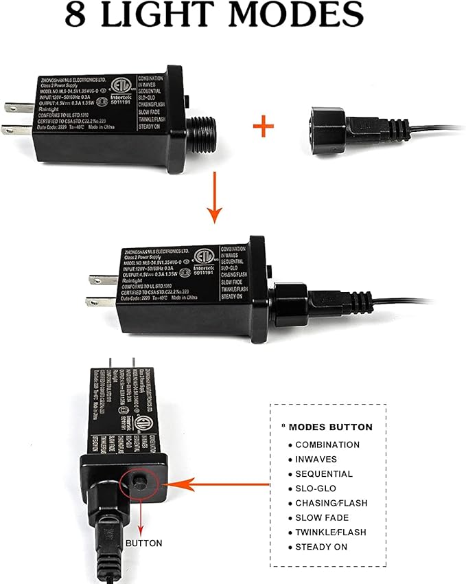 • Convenient Timer Function & 8 Modes & Memory Function: The button is at the end of the plug to turn on/off the timer function, press the button for few seconds till the green light on/off to turn on/off the timer function and switch 8 modes (combination, in waves, sequential, slo glo, chasing/flash, slow fade, twinkle/flash, steady on). This fairy lights could remember the setting of previous night you set.