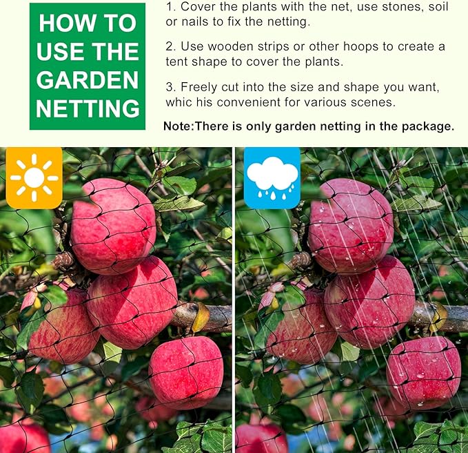 • Protect Garden Plants & Fruit Trees: Our fruit tree netting are large in size and can provides maximum protection without harming birds and small animals or interfering with plant growth; It can effectively prevent damage and protect fruit trees, berries, bushes, shrubs, plants, flowers and vegetables