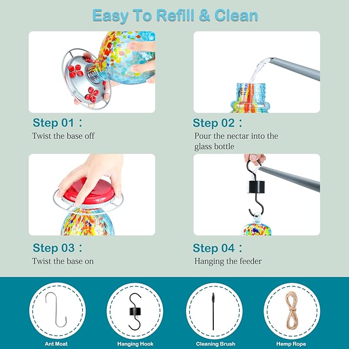 • Easy to Fill and Clean: With a wide mouth design and simple structure, it's very easy to refill nectar and also convenient to clean with a bottle brush. Transparent glass makes refilling and seeing the feeder with nectar easy