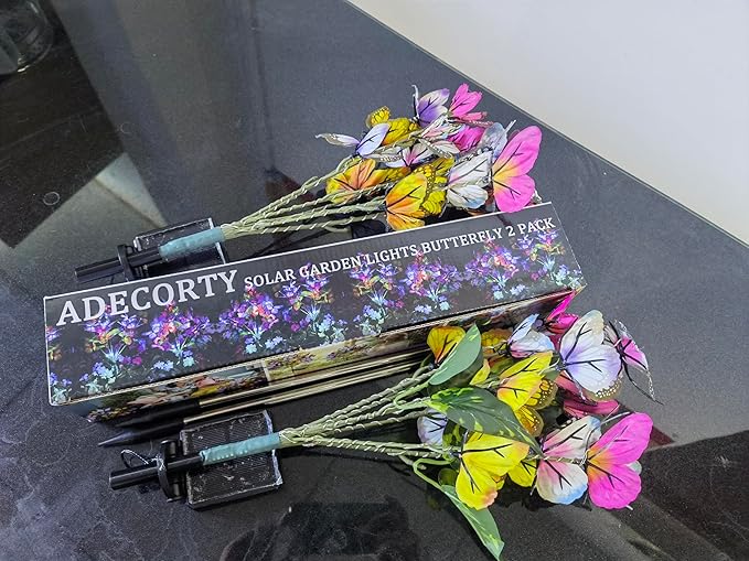 • 【NEW UPGRADED UNIQUE BUTTERFLY SOLAR GARDEN STAKE LIGHTS】2 Pack Solar Garden Lights Outdoor are composed of 34 lifelike butterflies and 44 multi-color LEDs fairy string lights. The Butterflies are made of high quality fabric and exquisitely designed to imitate real butterflies, adding lots of vitality for your garden or yard.