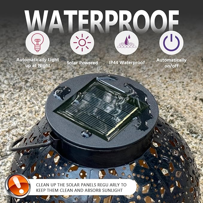 • Dusk to Dawn Auto ON/OFF: During the day, the solar panel converts sunlight into electricity and recharge the battery. At night, the solar lanterns turn on automatically from the electricity stored during the day.Bright LED lights last for at least 8 hours at night.