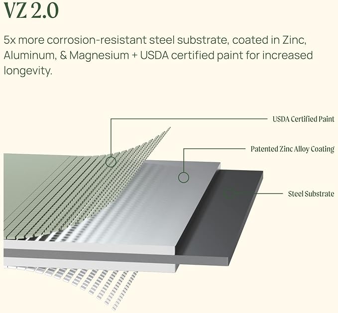 • Better Material: We have combined a Zinc, Magnesium, and Aluminum coated steel with our award-winning and USDA approved AkzoNobel paint to develop a new material which we call VZ 2.0. The first material of its kind is 100% safe, eco friendly, with a long 20+ year life. VZ 2.0’s exceptional performance has been verified at the Texas A&M National Corrosion & Materials Reliability Lab