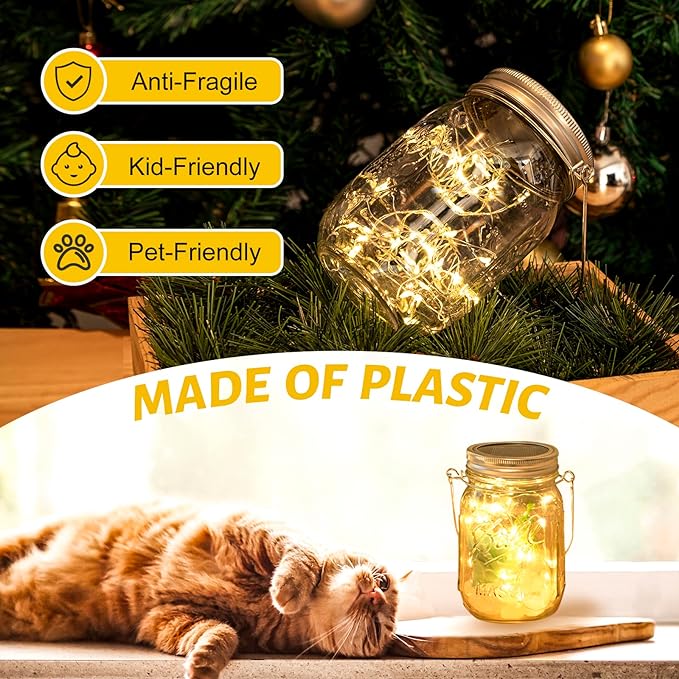• Safe and Waterproof: Solar powered, easy to use, no wires required, no extra bill. Good heat dissipation, cool and safe to touch without risk of burns; The solar mason jar lights are waterproof, so there is no need to take inside during rainy or light snow days but cannot be totally submerged in water; Great for indoor and outdoor use; Perfect for wedding, party, BBQ, picnic, home, balcony, fence, driveway, garden and tree decor, the night looks with jars of "fireflies" lighting up your space