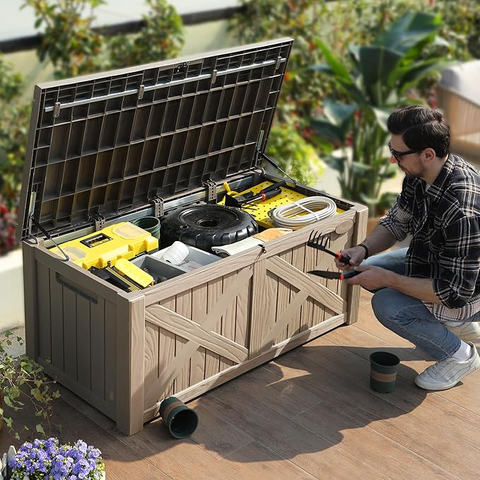 • LARGE STORAGE SPACE- 120-gallon capacity results in a roomy storage solution for your garden tools, pool supplies, sporting equipment, etc., on patio, deck, or porch; Featuring 440lbs. weight capacity, this waterproof outdoor storage box can double as an extra table or patio bench to accommodate two adults.
