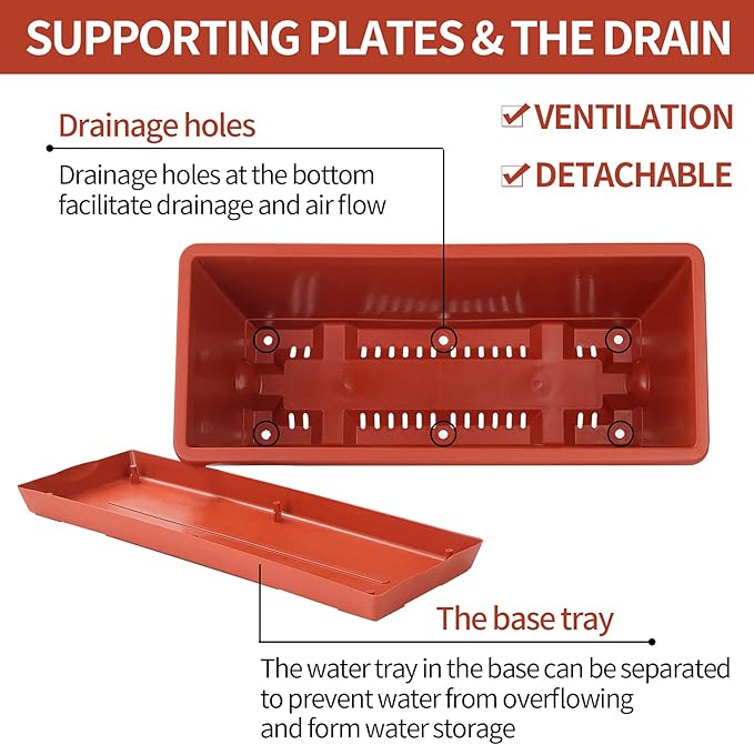 • WINDOW BOX PLANTERS DIMENSIONS - Includes pack rectangular plastic planters. The size of plastic flower planters: L16.6 x W7 x H5.9 inches, large enough to support any projects and ideas. Great for herbs, flowers, foliage, grass, cactus, succulents, ferns, arborvitae and more.