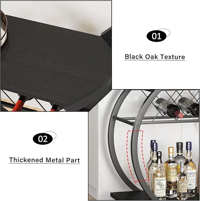 LVB Black Wine Cart with Wheels, Modern Bar Cart with Wine Rack, Industrial Beverage Rolling Kitchen Serving Cart with Storage, Metal Wooden Microwave Drink Liquor Cart for Home Dining Room, Black Oak