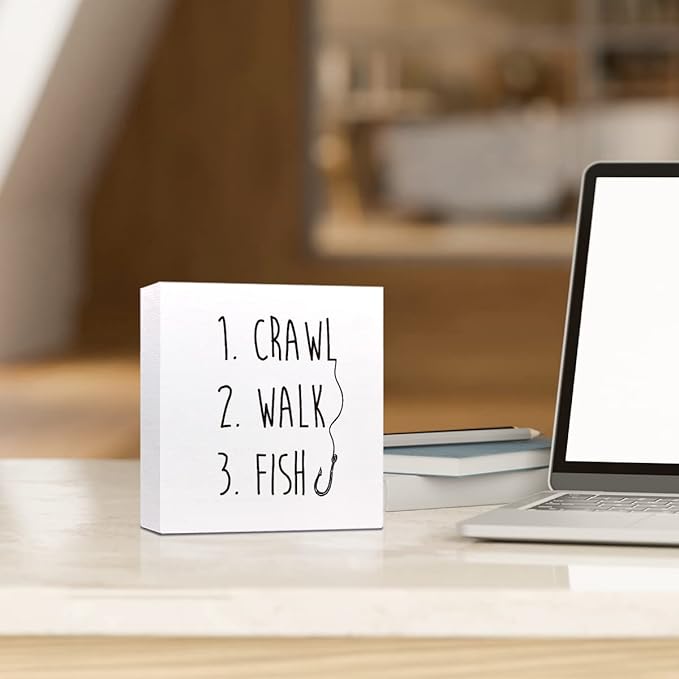 Crawl Walk Fish Rustic Wooden Sign Desk Decor,Funny Baby Fishing Wood Block Sign Desk Decorations for Home Bedroom Baby Room Desk Shelf Table Decor