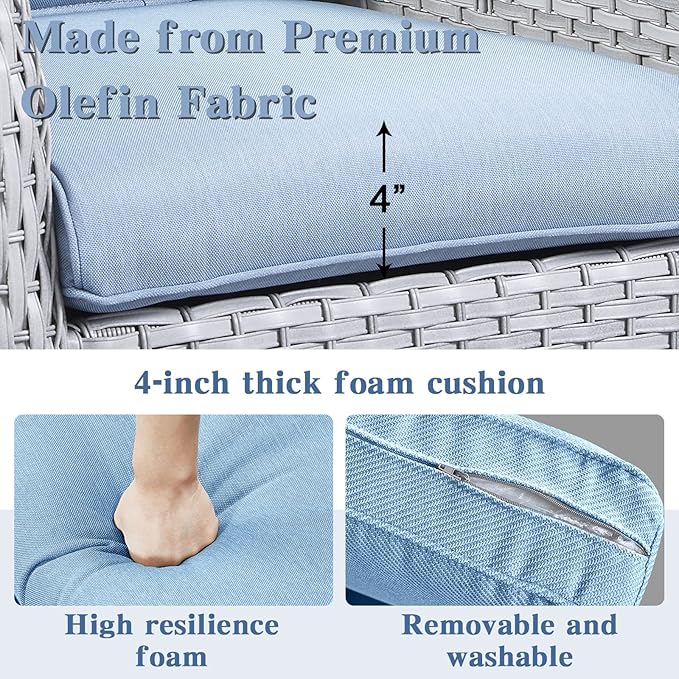 • 4.Comfortable And Easy To Clean: Both chairs in this outdoor patio set are equipped with 4-inch thick foam seat cushion and 8-inch thick cotton back cushion, which is ergonomic and improves the overall comfort of the wicker chair. The patio chair cushion covers are made of outdoor specialty olefin fabric that is water resistant, and each cushion is equipped with zippers that are removable and easy to clean.