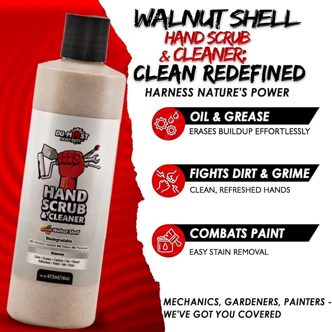 • DU-MOST Hand Scrub & Cleaner with walnut shells is highly effective in removing stubborn stains. Ideal for after-work clean-up for mechanics and farm workers
